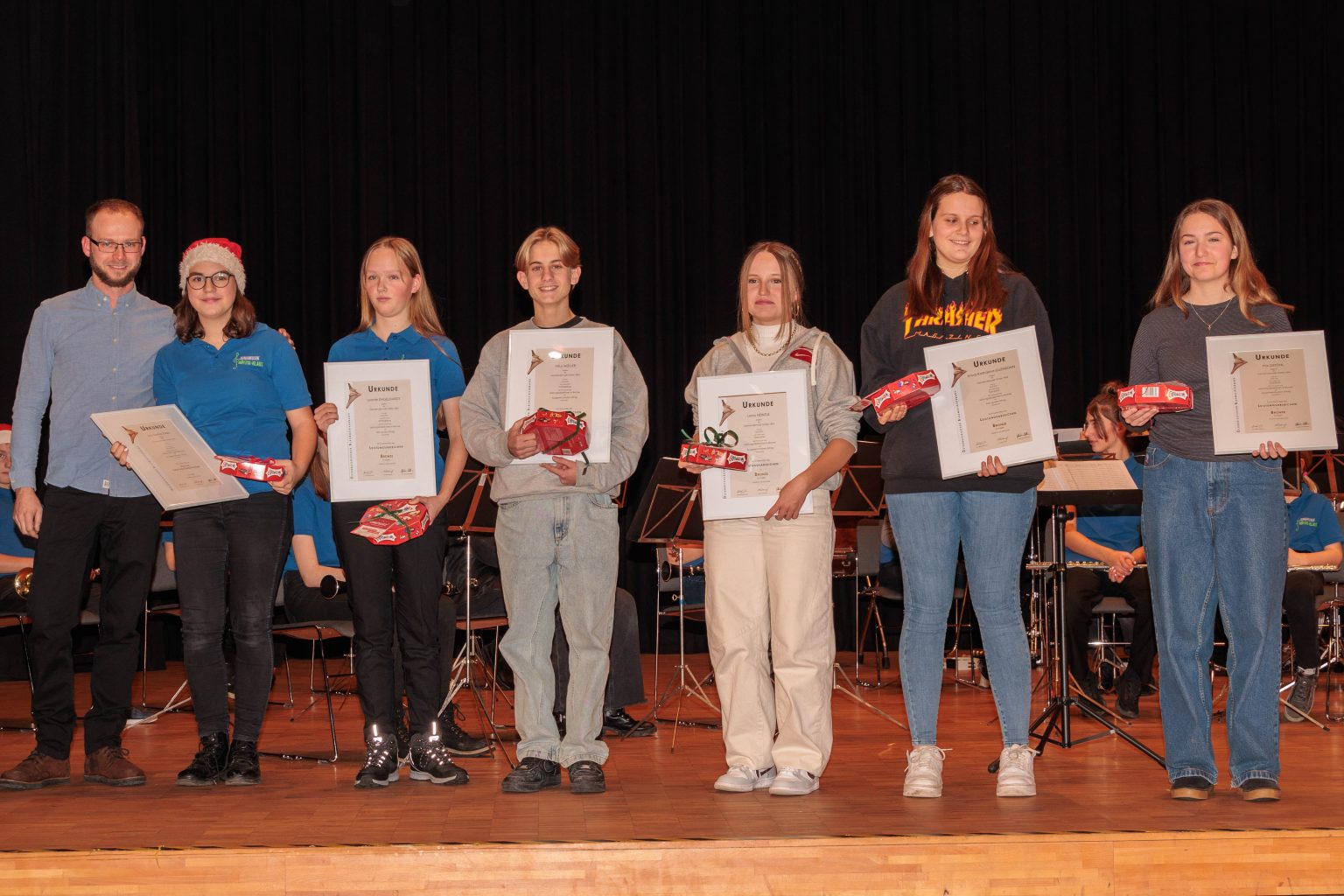 Jugendreferent Christoph Ellensohn gratulierte im Namen des gesamten Vereins ganz herzlich Lena Heinzle (Klarinette), Anna Ellensohn (Trompete), Pia Gstöhl (Horn), Vitus Müller (Schlagzeug) und Leonie Engelhardt (Schlagzeug) zur bestandenen JMLA Prüfung in Bronze sowie Kiara Stark (Tenorhorn) zur Erlangung des Junior Abzeichen. Neben der Urkunde und den Abzeichen gab es für alle auch noch ein kleines Präsent für die ausgezeichneten Leistungen.