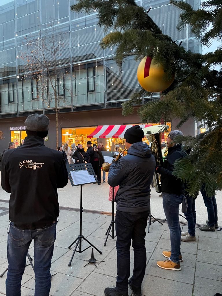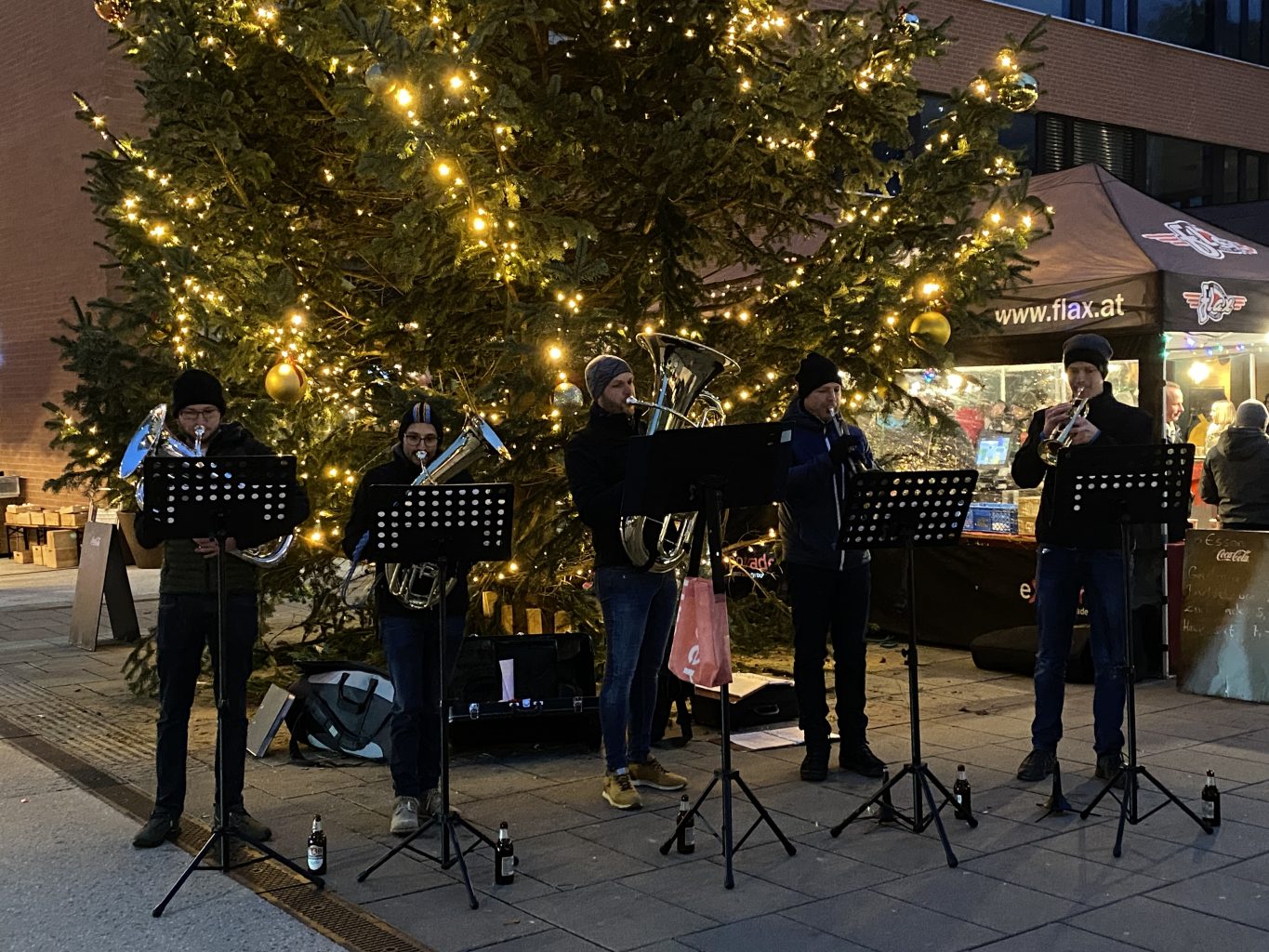 Am 3. Dezember unterhielt ein Bläserensemble unserer Jungmusik und die Brasspartie Brass & Drums die Weihnachtsmarkt-Besucher:innen Am Garnmarkt in Götzis.